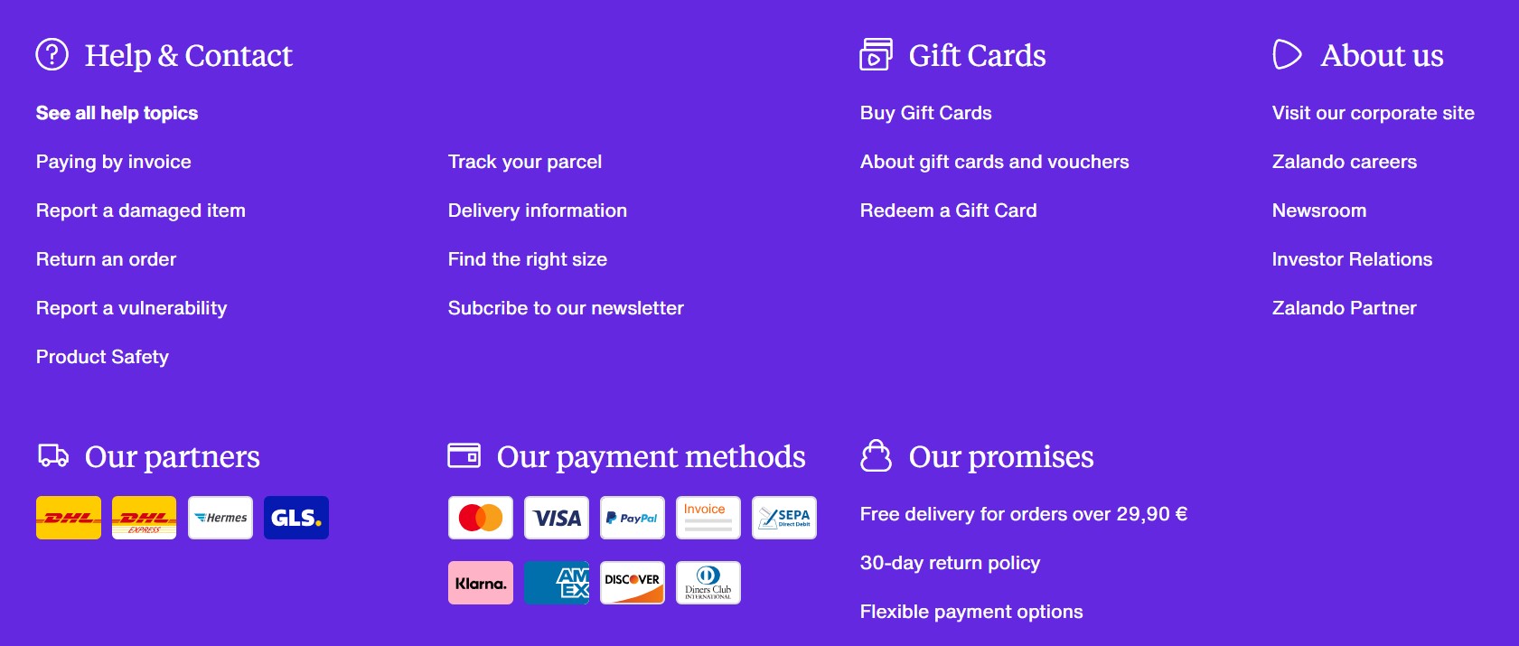 Il footer di Zalando è un ulteriore esempio di un’integrazione più ampia, ma è molto più diretto grazie alla sua struttura chiara. Aiuta i clienti ad accedere rapidamente alle informazioni riguardanti il servizio al cliente, le offerte di carte regalo e i metodi di pagamento. Inoltre, include anche dei link ai contenuti legali, alla sezione “Chi siamo”, dove si trovano anche i programmi partner e le offerte di lavoro, alle applicazioni mobili di Zalando e agli account dei social media.