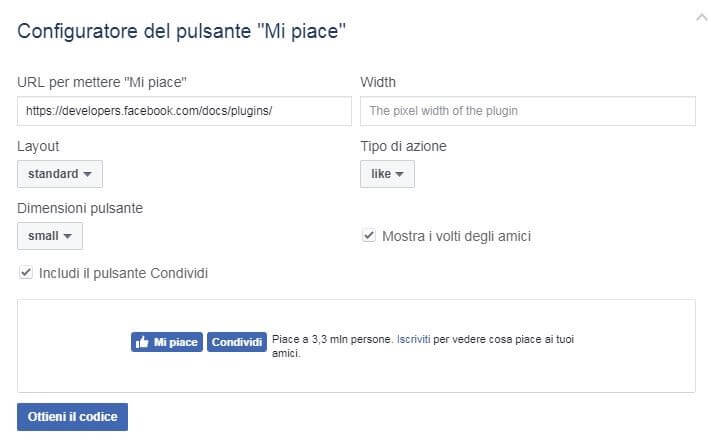 Per generare un pulsante Facebook Mi piace o Condividi, avete bisogno del configuratore di codice, che trovate nella sezione di Facebook per gli sviluppatori “facebook for developers”. Vi spieghiamo con un esempio come si genera un pulsante Mi piace tramite questo tool: prima di tutto è necessario controllare la pagina riepilogativa di Facebook su cui sono presenti i plug-in social e dove si può scegliere il pulsante Mi piace.