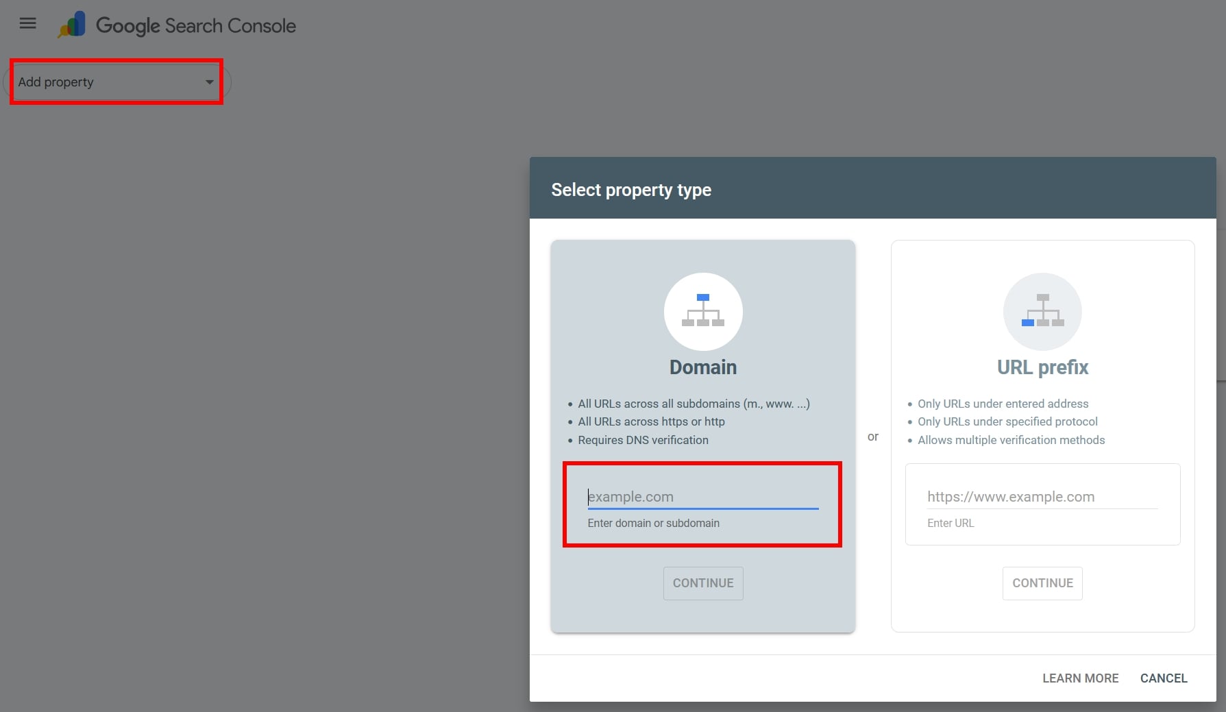 Registri il tuo sito web nella barra laterale sinistra. A tal fine, fai clic sul pulsante “Aggiungi proprietà”. Nella finestra visualizzata, inserisci l’URL completo del tuo sito web nel campo a sinistra. Successivamente, clicca sul pulsante “Avanti” per inviare la tua richiesta di indicizzazione.