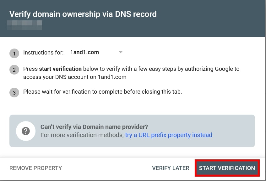 Nel passaggio successivo, devi dimostrare che il dominio è il tuo. Il processo esatto varia a seconda del provider di dominio. Se il tuo provider offre un processo di configurazione guidato, l’assistente verrà selezionato automaticamente dalla Search Console. Per un dominio di IONOS, ad esempio, avvii il processo di verifica cliccando su “Verifica”.