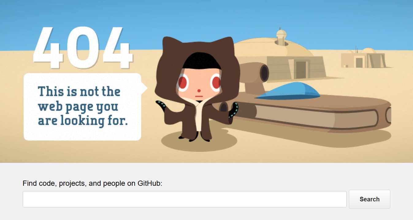 Il servizio online per sviluppatrici e sviluppatori di software è sicuramente utilizzato anche dai fan di Star Wars. La pagina 404 di GitHub gioca su una citazione famosa della saga e fa sorridere alcuni utenti, inclusa la mascotte di GitHub in stile Jedi.