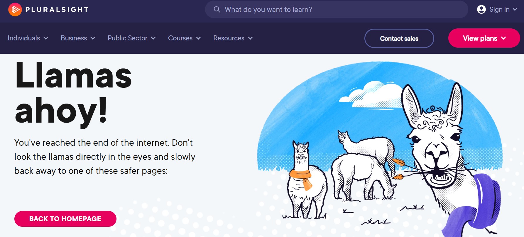 Nella scuola di programmazione online Pluralsight, le visitatrici e i visitatori vengono accolti da lama nella pagina di errore. Il consiglio: non guardare gli animali negli occhi e cerca lentamente pagine più sicure.