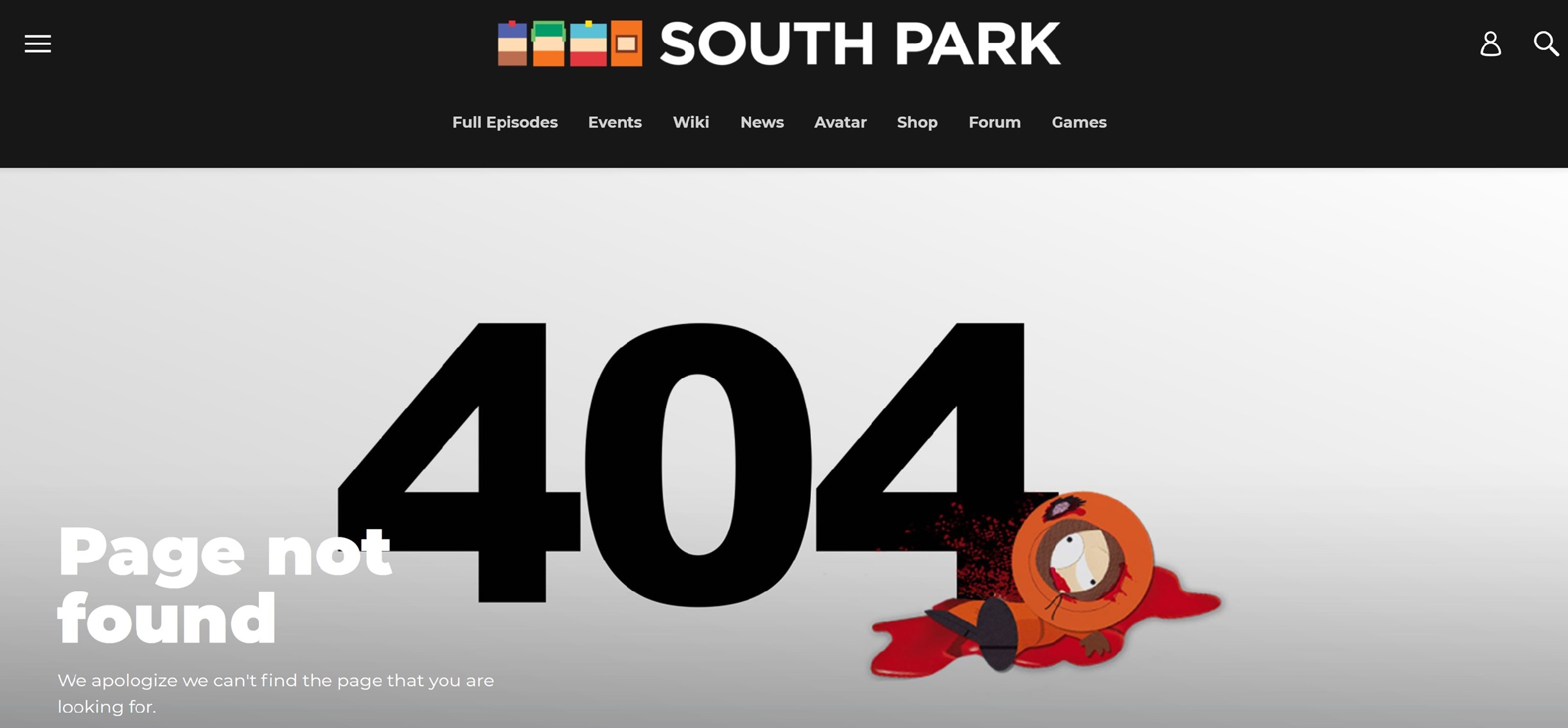 Il sito di South Park sfrutta il suo oscuro umorismo per la pagina 404. Il numero di errore sovradimensionato è accompagnato dal corpo senza vita di Kenny, un personaggio famoso per le sue continue morti sullo schermo. La gag visiva si adatta perfettamente al tema, trasformando un errore tecnico in una battuta riconoscibile. La scritta chiara “Page not found” e la breve spiegazione sottostante mantengono intatta la funzione della pagina, mentre il design strizza l’occhio ai fan con la sua esecuzione ironica.
