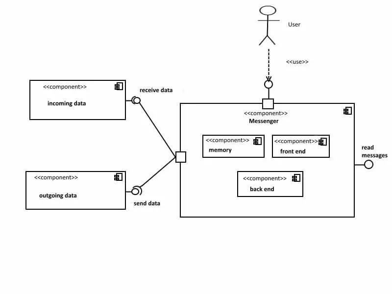 Componente: i componenti sono parti costitutive che limitano il proprio contenuto dal sistema esterno. Solo attraverso interfacce o porte c’è un collegamento verso l’esterno. Un connettore di composizione si connette a un altro componente attraverso l’interfaccia. Il connettore di delega collega gli elementi interni con un’interfaccia sul confine esterno. I componenti sono modulari e intercambiabili.