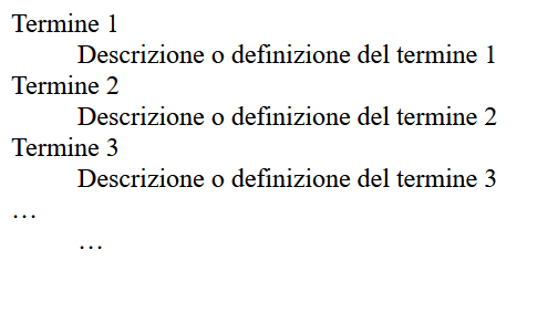 <dl>…</dl>: acronimo di “definition list”; definisce l’inizio e la fine della lista<dt>…</dt>: acronimo di “definition term”; indica il termine da spiegare<dd>…</dd>: acronimo di “definition description” (dd); indica la descrizione, la definizione o la spiegazione del termine relativo ed è inserito subito dopo il tag<dt>.