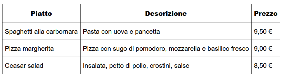Per illustrare le possibilità dei tag per una tabella, riportiamo di seguito un semplice esempio di tabella HTML. A titolo di esempio vengono presentati descrizioni e prezzi di tre piatti. Nella riga di intestazione, definiamo i tre titoli delle colonne “Piatto”, “Descrizione” e “Prezzo”. Seguono altre tre righe in cui vengono fornite le informazioni. La tabella HTML ha quindi un totale di quattro righe e tre colonne: