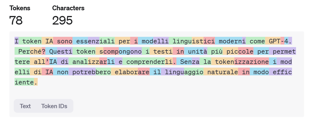 Il modello GPT-4o suddivide questo testo, composto da 295 caratteri, in 78 token, rappresentanti nella maniera seguente: