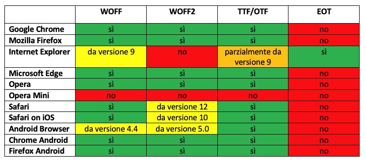 Il problema diventa ancora più evidente per gli utenti che lavorano ancora con Internet Explorer. Le varie versioni del browser Microsoft supportano infatti il formato EOT (Embedded OpenType), che però non è supportato da nessun altro browser.