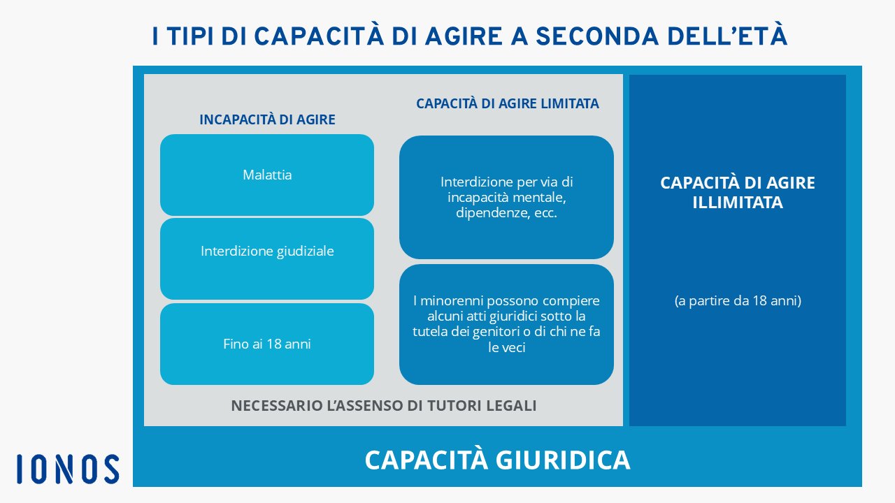 Come già menzionato, tutte le persone fisiche acquistano la capacità giuridica sin dalla nascita, ma per quanto riguarda la capacità di agire se ne possono rilevare tre tipi, a seconda dell’età e della salute mentale: