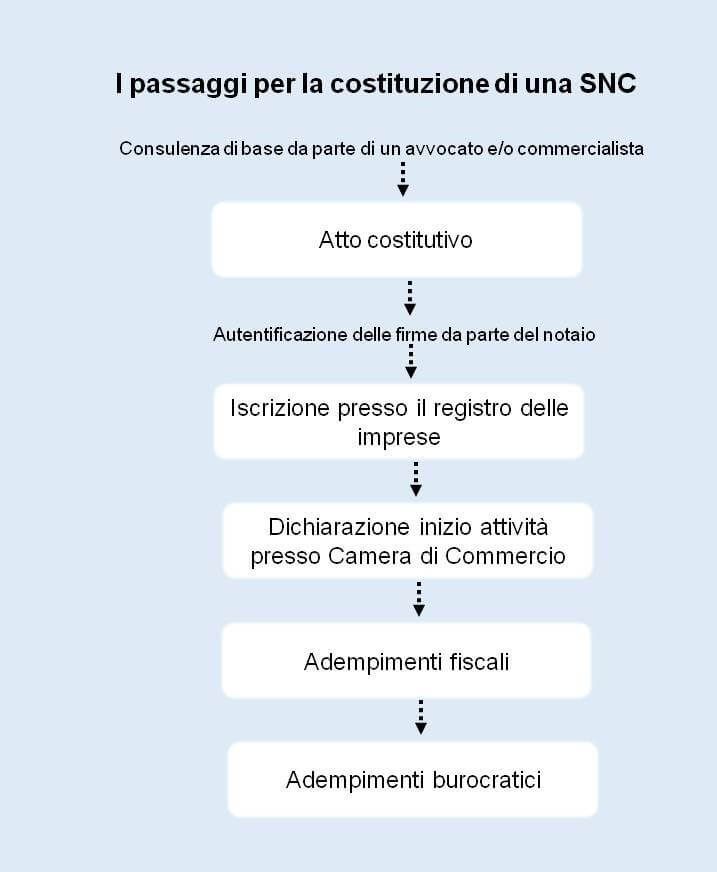 Il primo passaggio da compiere per costituire una S.n.c. è quello di depositare l'atto costitutivo ai sensi dell'art. 2295 del Codice Civile. Tale atto deve essere redatto in forma scritta dagli amministratori e depositato presso il registro delle imprese (si parla in questo caso di pubblicazione). Le firme dell'atto devono essere autenticate da un notaio, che procederà poi con l'iscrizione nel registro delle imprese per conto della SNC. Qualora la società venga costituita senza atto scritto o se l'atto non viene depositato presso il registro delle imprese, si tratta di una società irregolare che segue le regole della società semplice.