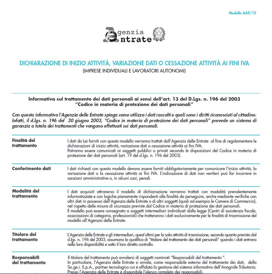 Nel caso di persone fisiche, per presentare la dichiarazione di inizio attività (quindi aprire la partita IVA), variazione dati o cessazione attività ai fini IVA è richiesta la compilazione del modello AA9/12, che deve essere presentato entro 30 giorni dalla data di inizio attività.