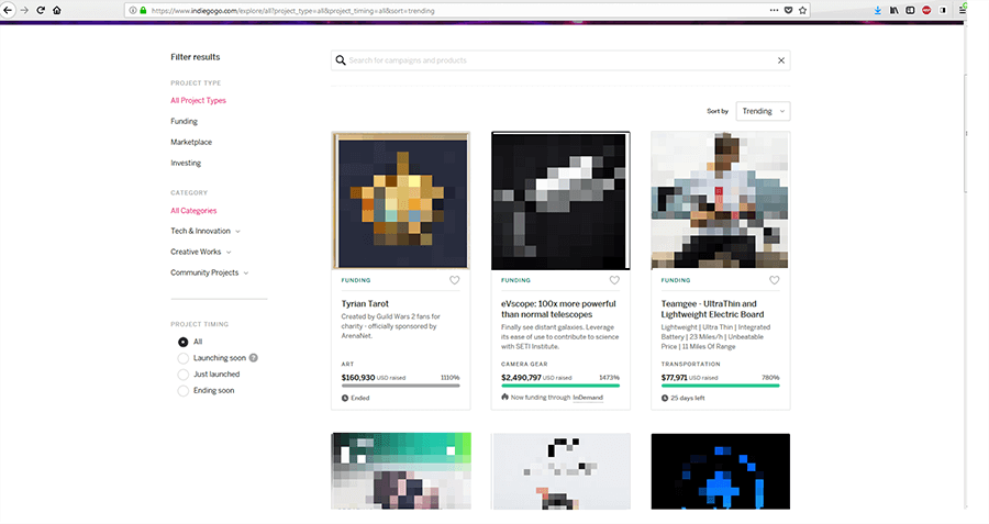 Per quanto riguarda il design, Indiegogo convince con un minimalismo moderno e qui non va trascurata la similitudine con Kickstarter. La struttura piuttosto scheletrica del sito sposta l’attenzione sulle campagne. La navigazione della piattaforma è scorrevole e organizzata in maniera sensata, in particolare risalta l’ordine dei progetti organizzati per tempo (ad esempio “Launching soon” e “Ending soon”, in italiano rispettivamente “Presto online” o “Sta per terminare”). Inoltre i progetti si possono ordinare in generale per popolarità (probabilmente derivata dal numero di clic) e filtrare le campagne che hanno realizzato più guadagni. Per il resto sono suddivise nelle classiche categorie e sottocategorie.