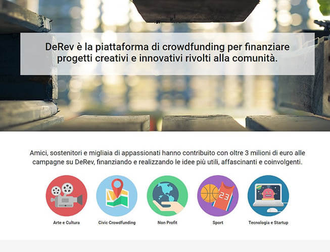| DeRev | 2013 | Italiano | 20.000 persone hanno contribuito almeno a un progetto sulla piattaforma | 4 % per il fundraising, 5 % per “All or nothing” e 9 % per “Keep it all” | Finanziamento per ricompensa/donazione (secondo i principi “All or nothing”, “Keep it all” o “Fundraising”) | Artisti, inventori, start-up, associazioni benefiche e non a scopo di lucro, enti e istituzioni pubbliche |