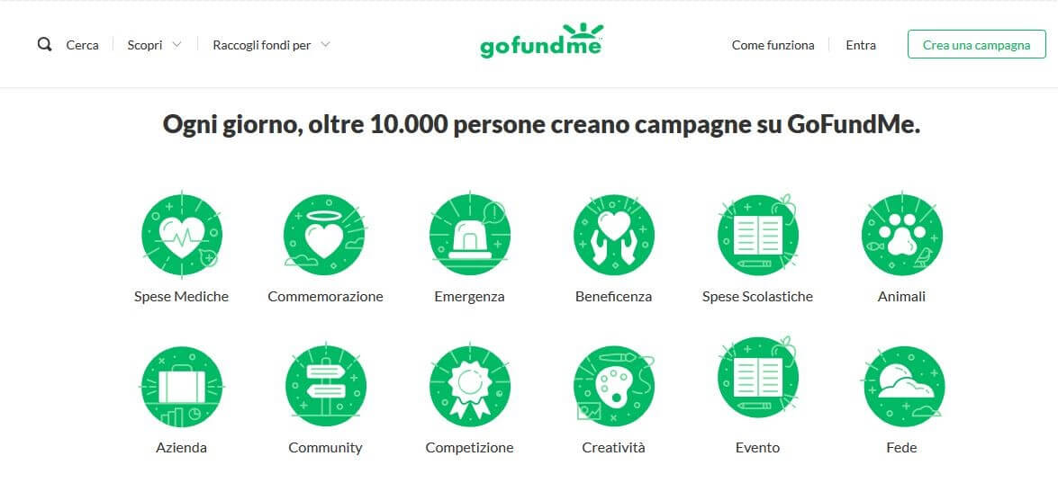 Il sito GoFundMe rientra tra le piattaforme di crowdfuding più popolari, che si è specializzata sin dall'inizio nel settore della beneficienza e del non profit. Le campagne su GoFundMe raccolgono per la maggior parte fondi per eventi sociali e progetti benefici. GoFundMe ha iniziato la sua attività nel 2010 e fino al 2017 sono stati generati oltre 5 miliardi di dollari. Le campagne prevedevano essenzialmente una commissione del 5 percento per ogni donazione ricevuta, tuttavia per i responsabili del progetto che provenivano dall’Europa sorgevano costi aggiuntivi al momento di fare un versamento dall'estero. Da maggio la politica della piattaforma è cambiata e per l'Italia è ora prevista una commissione totale del 2,9 percento più un importo fisso di 25 centesimi per donazione.