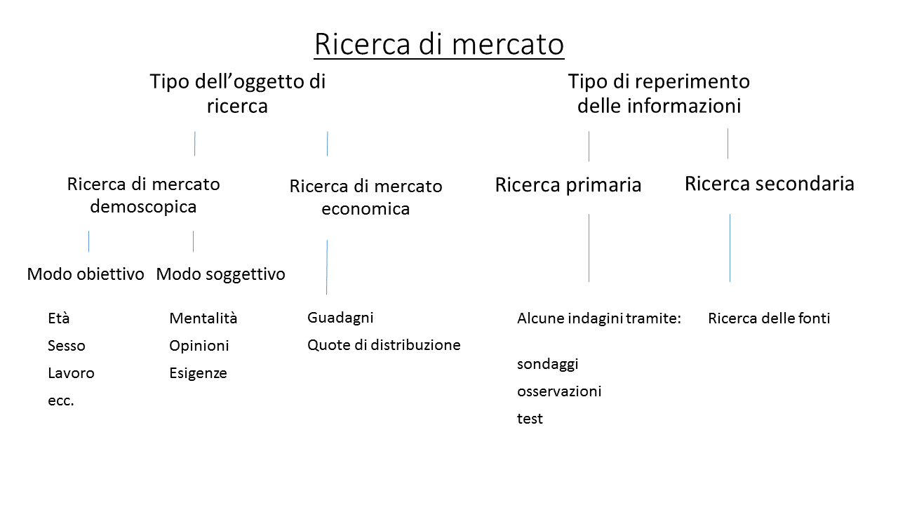 Nell’ambito della ricerca di mercato è possibile differenziare la tipologia dell’oggetto di ricerca dalla tipologia di reperimento delle informazioni. Entrambe queste tipologie si possono suddividere in due sottocategorie.