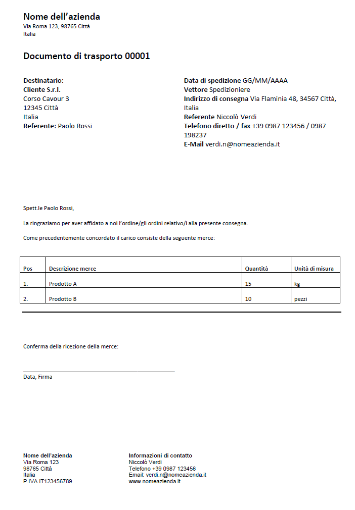 Un modello pronto all’uso per l’impostazione del proprio documento di trasporto