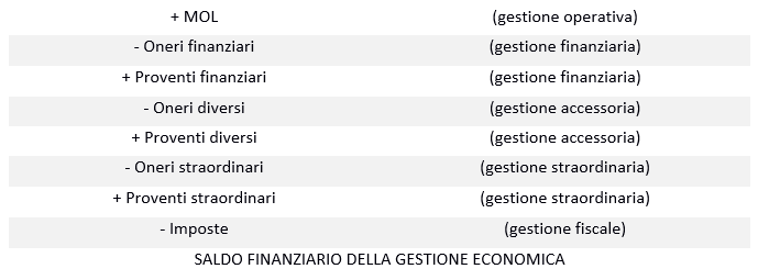 Il calcolo del MOL rappresenta il punto di partenza per l’analisi della dinamica finanziaria: esso richiede che nel rendiconto finanziario siano messi in evidenza anche gli eventuali contributi provenienti da altre tipologie di gestione. Come risulta dalla seguente tabella, in questo modo si rendono chiari i contributi provenienti dalle diverse gestioni destinati alla dinamica monetaria.