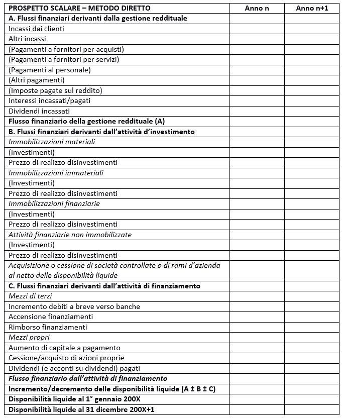 Per quanto riguarda la determinazione dei flussi di cassa della gestione reddituale la struttura è differente, mentre rimane la medesima per le aree relative alla gestione degli investimenti e dei finanziamenti.