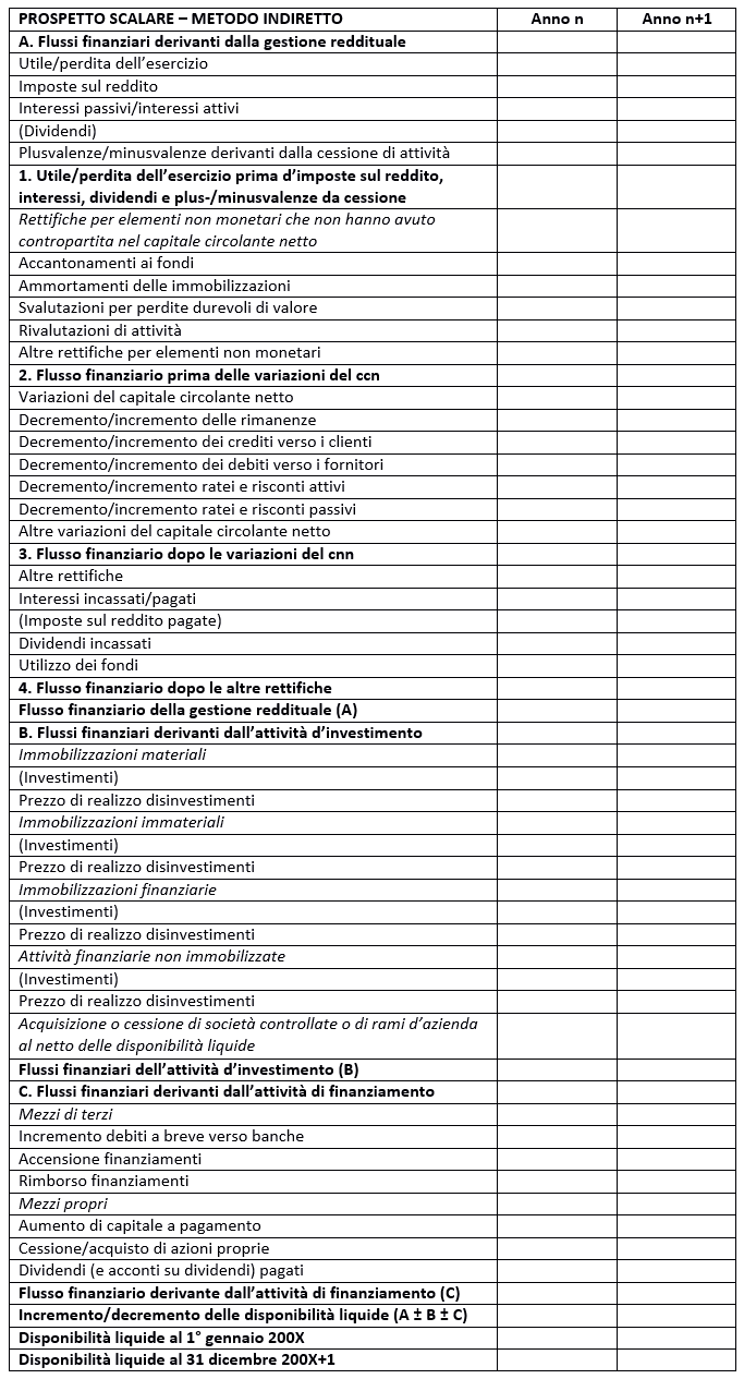 Si può giungere allo stesso esito con l’altro metodo disponibile, quello indiretto, il cui prospetto ha il seguente aspetto: