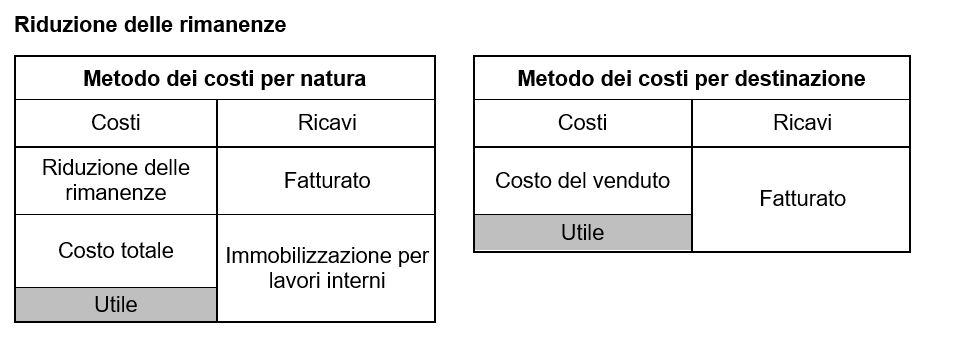 Alle rimanenze viene anteposto un segno matematico (+/-): se l’importo delle rimanenze a fine esercizio è maggiore di quanto lo era all’inizio, la voce sarà contrassegnata da un "+", se invece l’importo è inferiore viene evidenziato da un "-". Con il metodo dei costi per natura, le variazioni delle rimanenze possono comparire sia sul lato dei costi che su quello dei ricavi.