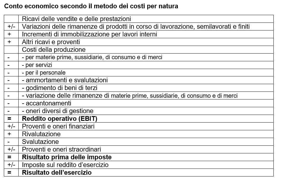 L’articolo 2425 del Codice civile italiano definisce il contenuto del conto economico secondo il metodo dei costi per natura, specificando le singole voci da includere, che possono essere sintetizzate così: