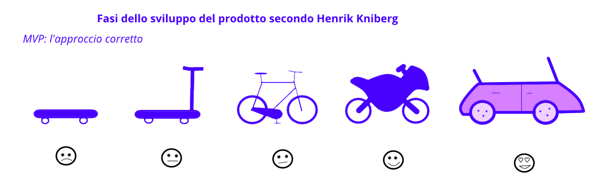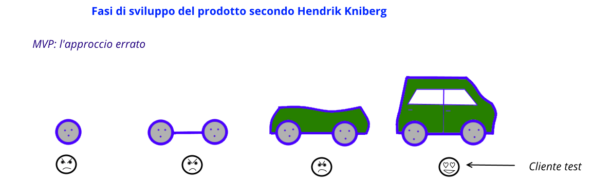 In uno schizzo rapido, Hendrik Kniberg ha illustrato fino a che punto questo approccio viene spesso interpretato o usato erroneamente. Lo schizzo seguente mostra un processo di sviluppo in cui l'approccio MVP è stato attuato in modo scorretto. Ogni simbolo rappresenta, da sinistra a destra, un ulteriore sviluppo del prodotto in arrivo sul mercato. Gli smiley sottostanti rappresentano la reazione del cliente. Il prodotto finito è un'automobile. Il veicolo deve consentire allo sviluppatore di soddisfare un'esigenza specifica del cliente.