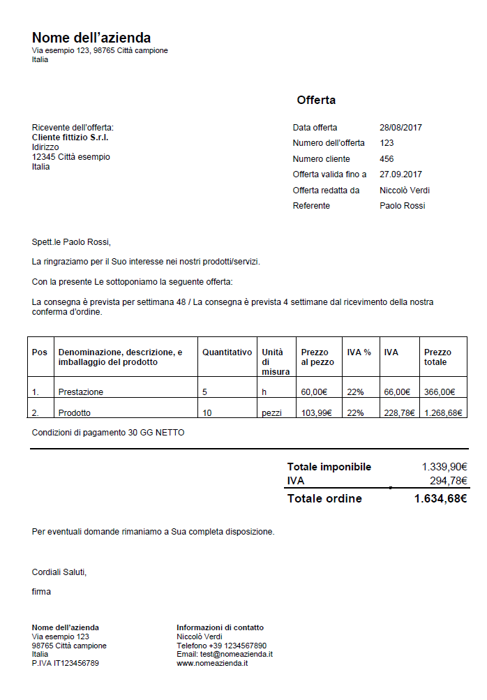 Come fornitore, quindi, è importante che tu proceda con grande cura alla preparazione dell’offerta, assicurandoti che i contenuti siano corretti, giuridicamente sicuri e completi. Se ricevi spesso un elevato numero di richieste è allora una buona prassi quella di utilizzare dei modelli di offerta pronti all’uso.