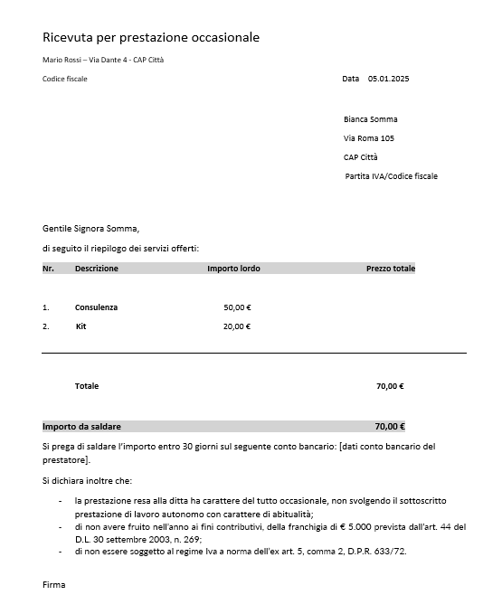 Fac-simile di ricevuta per prestazione occasionale da scaricare