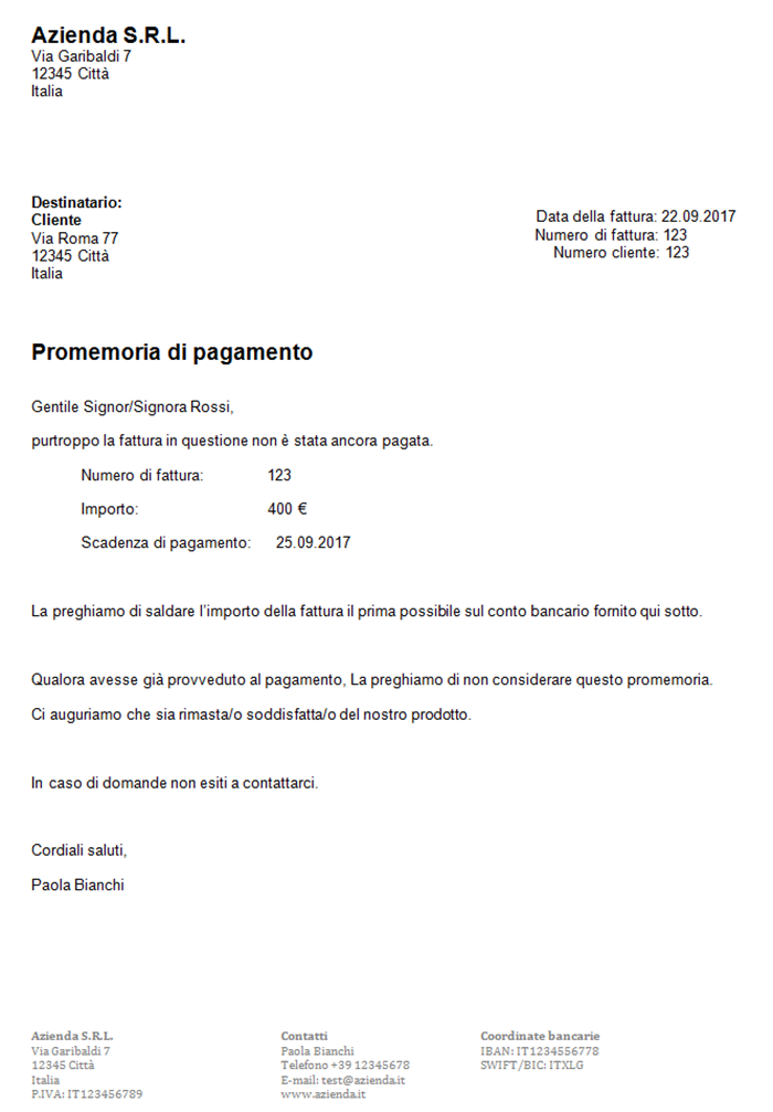 i. Piè di pagina: il piè di pagina del sollecito di pagamento comprende l’indirizzo completo dell’azienda, la sua partita IVA e le coordinate bancarie sulle quali deve essere effettuato il pagamento, comprensive di nome della banca, IBAN ed eventuale BIC. Fate attenzione anche qui che il segnaposto del modello sia completamente sovrascritto con i vostri dati personali.