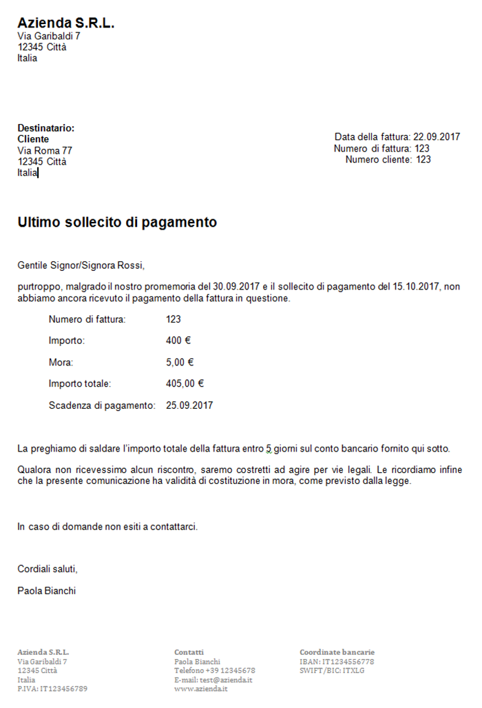 Ad essere importante non è tanto la forma di un sollecito di pagamento, quanto piuttosto il suo contenuto. Inoltre al sollecito può venire allegata una copia della fattura da pagare. Non è obbligatorio inserire un termine ultimo di pagamento e neanche far riferimento ad altre azioni legali, qualora non venga saldato l’importo. Spesso però vengono annesse simili diciture per aumentare la pressione nei confronti del debitore.