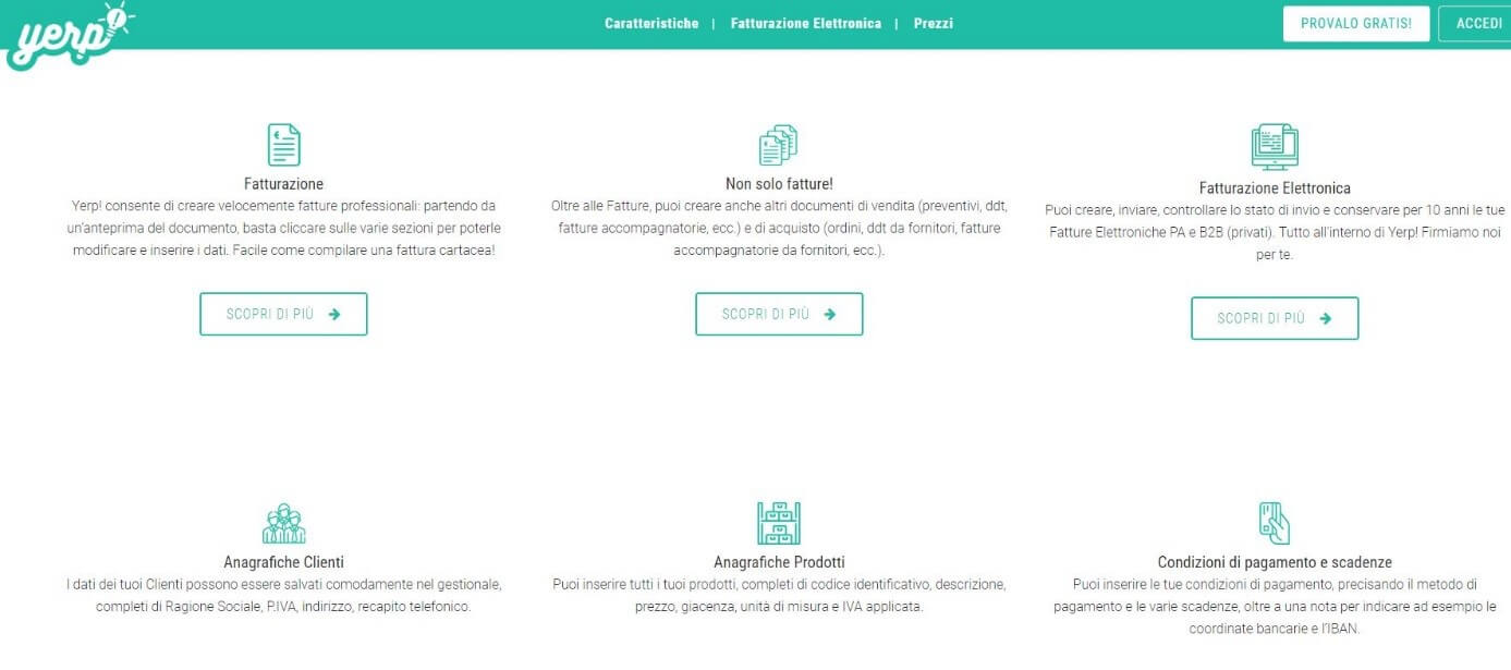Analogamente a Fiscolo funziona anche Yerp che pone particolare attenzione alla fatturazione dei liberi professionisti e delle piccole aziende. Già con la versione di base si potranno creare fatture elettroniche per la pubblica amministrazione e per privati. In più è possibile provarlo gratuitamente per 30 giorni.