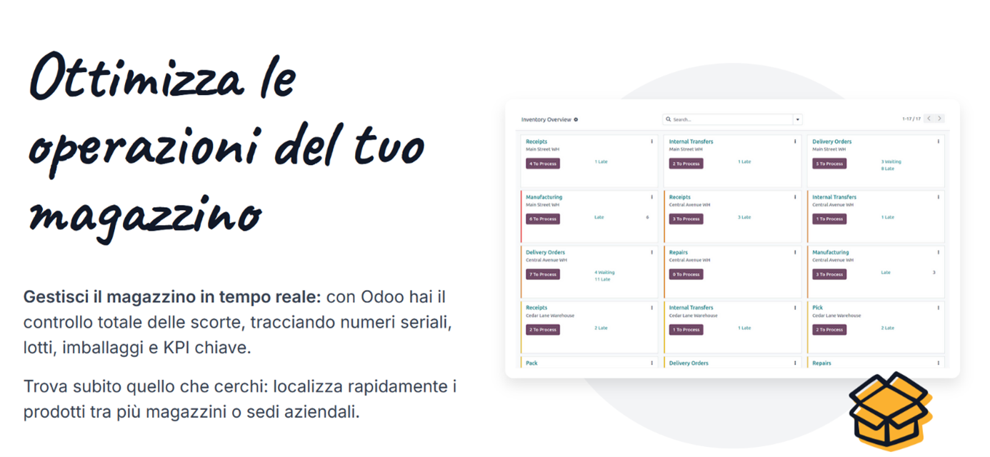 Odoo è un software open source multipiattaforma sviluppato con l’idea di ottenere una posizione predominante nel mercato dei software per le imprese. Questo software per l’inventario vanta una comunità di sviluppatori (anche italiana) che contribuisce attivamente all’ulteriore sviluppo dei programmi, a cui l’utente può fare riferimento e chiedere consiglio.