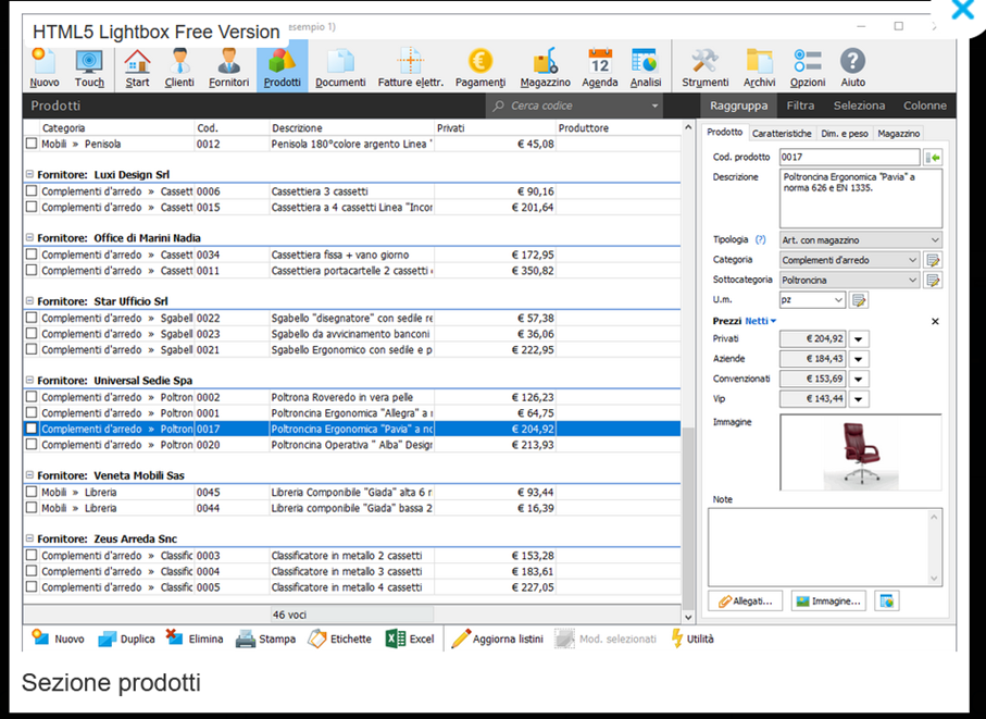 Si tratta di un programma per la gestione del magazzino pensato per tante attività commerciali diverse tra loro e riconducibili a vari settori di appartenenza. La gamma di funzioni offerte è notevole, tra cui: