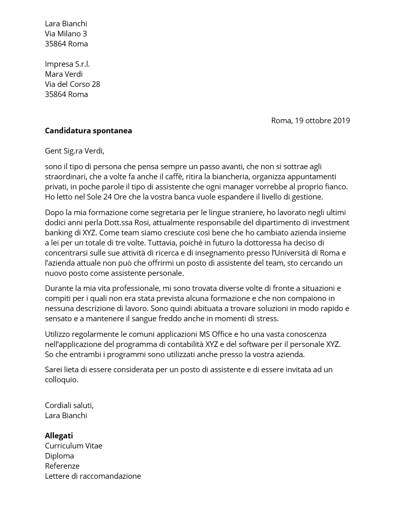 Tenete sempre presente che la vostra candidatura non riguarda un lavoro specifico, ma il vostro interesse per l’azienda.Ciò deve risultare chiaro già dalla lettera di accompagnamento di una candidatura spontanea, motivo per cui è di gran lunga la parte più importante. La struttura formale corrisponde a quella di unalettera di presentazione per una candidatura ordinaria; tuttavia, a seconda del settore, si può anche considerare di scegliere design più insoliti, soprattutto quando si tratta di professioni creative.