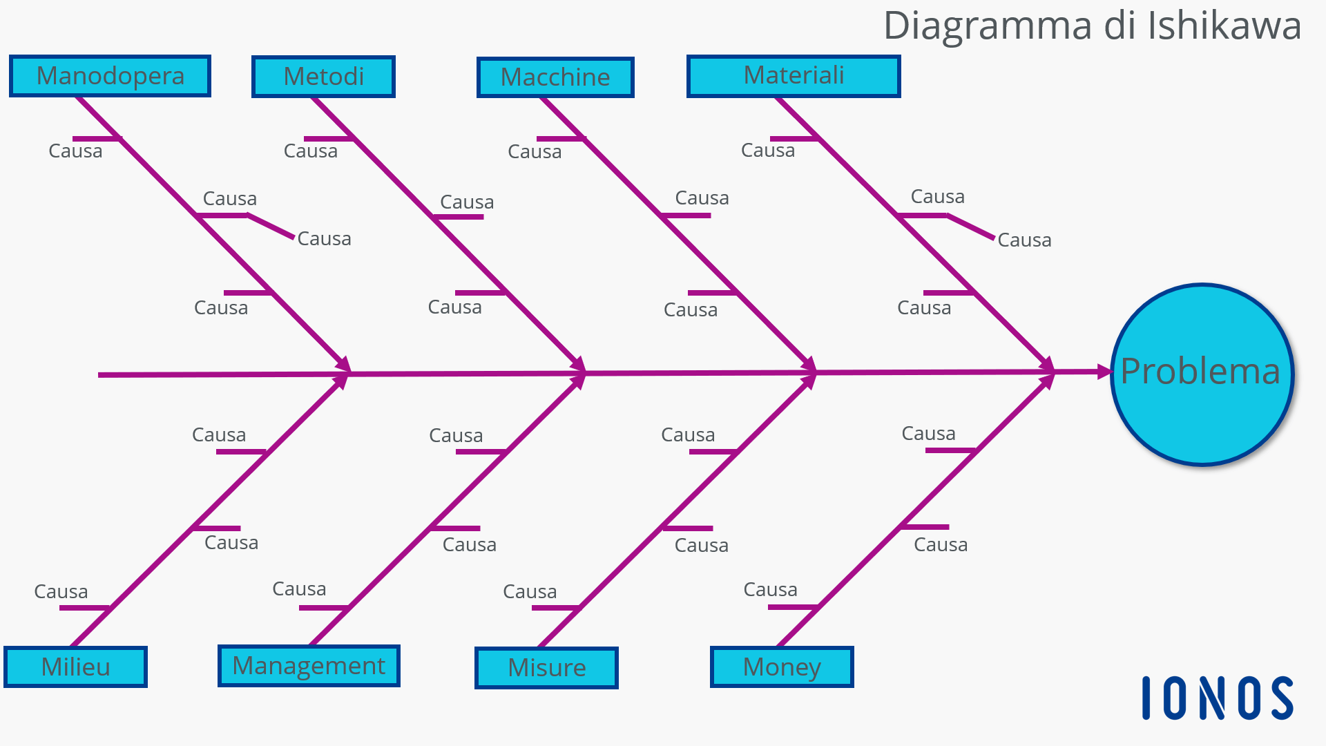 Nel migliore dei casi, dopo aver disegnato un diagramma di Ishikawa si ha un quadro completo delle cause di un problema reale. Tuttavia, affrontare tutti i punti contemporaneamente non sarebbe molto produttivo né efficace. Infatti, se dissipate le vostre energie e le vostre risorse in questo modo, rischiate di aver investito tempo e fatica nella risoluzione del problema senza però alla fine aver eliminato neanche una causa. Piuttosto, concentratevi solo su una causa del problema, la principale!
