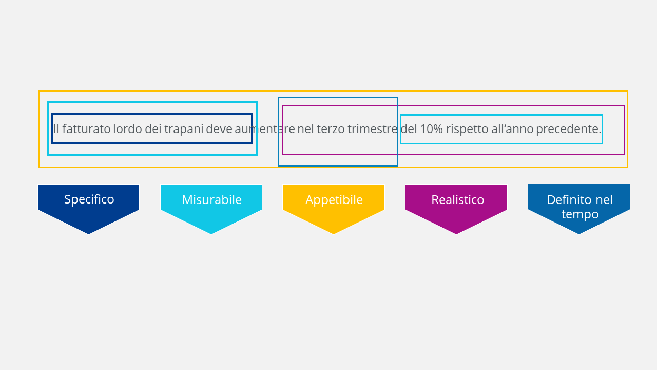 Specifico: gli obiettivi devono essere formulati nel modo più preciso e concreto possibile. Soprattutto in ambito aziendale è importante che la definizione degli obiettivi non lasci spazio all’interpretazione, in modo tale che il risultato da perseguire risulti chiaro. Inoltre, l’obiettivo deve essere sempre formulato in termini positivi. (Formulazione positiva: “Vogliamo tornare a una situazione di guadagno.” Formulazione negativa: “Vogliamo uscire dalla situazione di perdita.”)