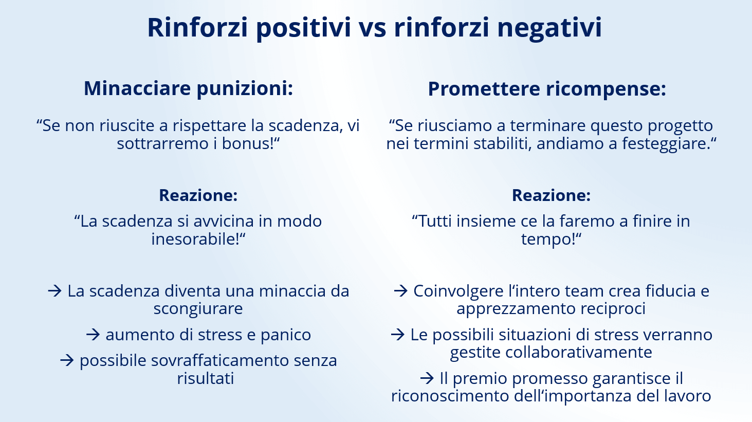 La motivazione estrinseca è un fattore che i supervisori possono influenzare. Il rinforzo negativo, tuttavia, dovrebbe essere utilizzato solo per cattiva condotta. Non ha senso minacciare i lavoratori di punizioni se non si rispettano le scadenze. Invece, un premio come una gita insieme o un giorno di vacanza in più è sicuramente un incentivo che funziona. Dopotutto, la motivazione intrinseca va mantenuta, e ciò si ottiene incentivando sentimenti positivi verso la professione. La punizione imminente promuove invece più che altro paure, stress, rallentando anziché velocizzando il lavoro.