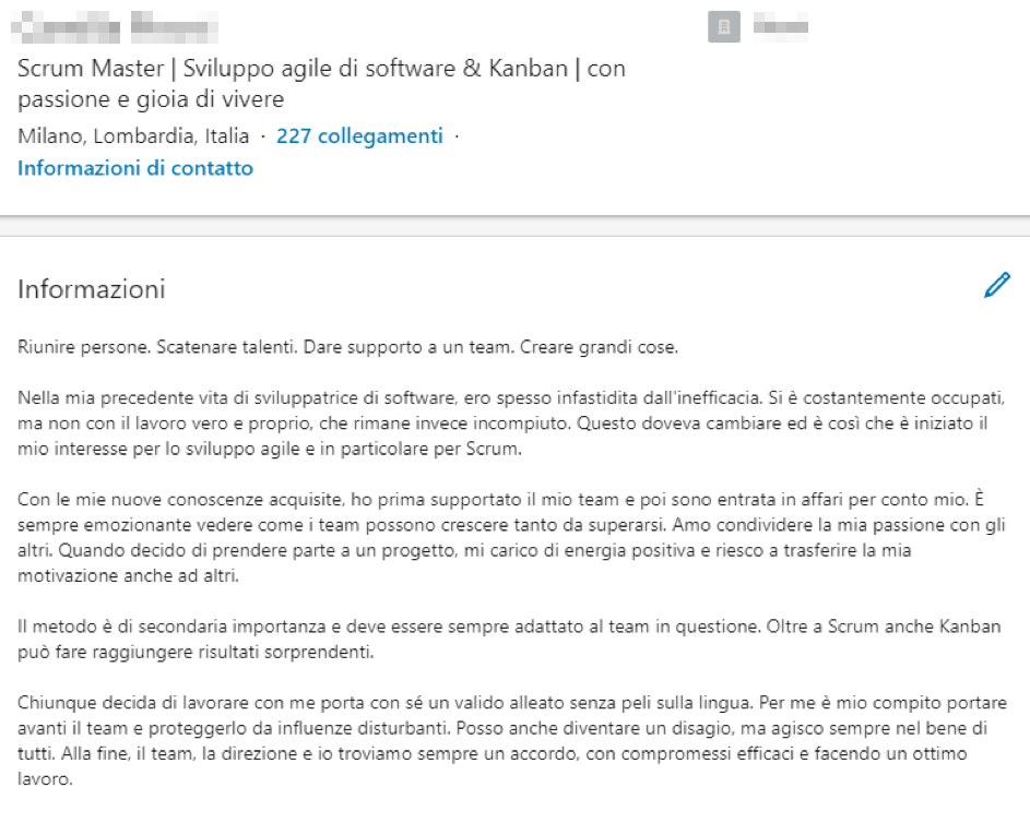 L'esempio di riepilogo di LinkedIn di cui sopra è accattivante soprattutto per la passione che il breve testo trasmette. Il tono sincero dell'autrice dell'esempio la rende simpatica ed è pari alle competenze descritte. Lo slogan del profilo collega il tocco personale con keyord importanti.