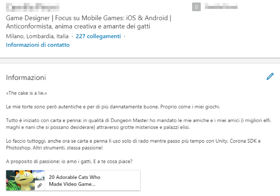 Il primo esempio è caratterizzato da un testo molto simpatico. È stato formulato con umorismo e rivela più sul carattere dell'autrice che sulle sue capacità. Tuttavia, contiene keyword rilevanti per il settore professionale sia all’interno del summary che nello slogan. In questo modo modo i potenziali datori di lavoro che utilizzano la funzione di ricerca arrivano subito a questo profilo. Ad esempio, se uno di loro è alla ricerca di un game designer in grado di gestire il motore Unity Engine e i programmi per Android, questo profilo LinkedIn dovrebbe apparire direttamente tra i risultati della ricerca.