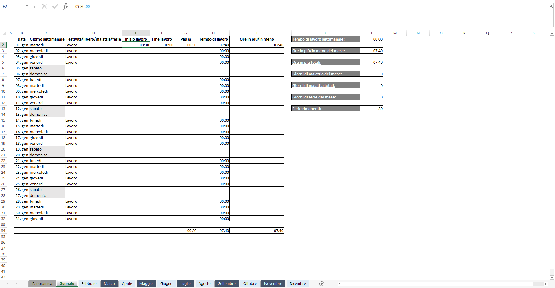 L’esempio seguente mostra un timesheet su Excel, utilizzato da un singolo dipendente come prova del tempo di lavoro svolto.Per fare questo, il dipendente inserisce gli orari in cui ha iniziato o terminato il turno, comprendendo anche l’inizio e la fine della propria pausa. Excel calcola poi automaticamente quante ore sono state lavorate e determina il tempo eventualmente accumulato o da recuperare. In questo modo il datore di lavoro risparmia molti sforzi nella contabilità salariale: inoltre, il dipendente può chiedere giorni di ferie e di malattia che vengono registrati automaticamente. Una formattazione chiara e un utilizzo sapiente dei colori mettono in evidenza le informazioni più importanti (ore di lavoro effettivo e ore in più o in meno).