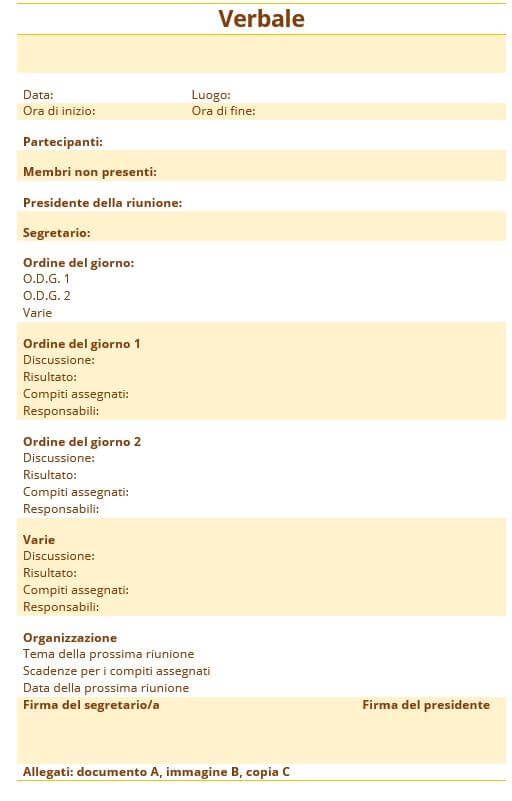 Abbiamo già trattato della struttura e del contenuto di un verbale. Di seguito trovate un possibile fac simile di un verbale di un’assemblea che potete utilizzare per la redazione del vostro verbale.