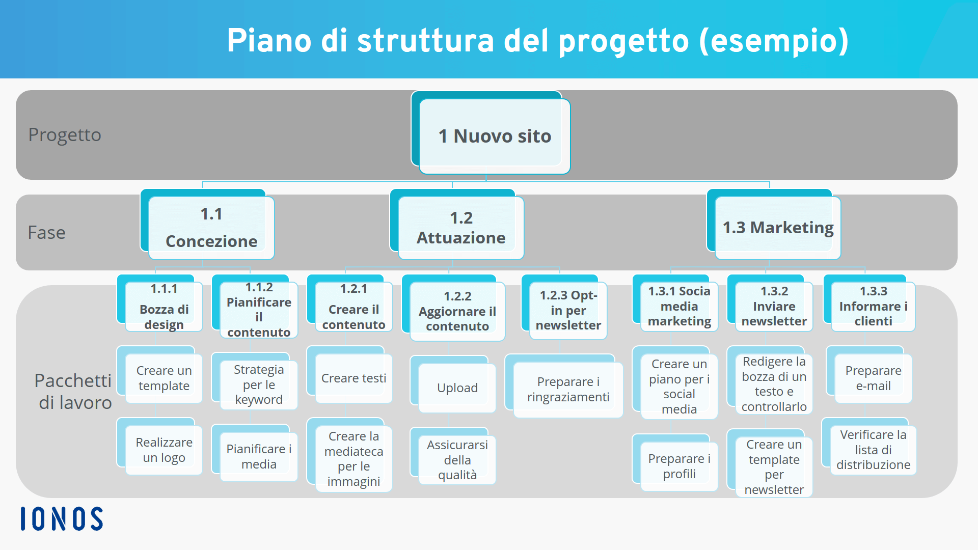 Una WBS strutturata in fasi per la creazione di un nuovo sito web aziendale potrebbe, nelle sue caratteristiche principali, avere il seguente aspetto: