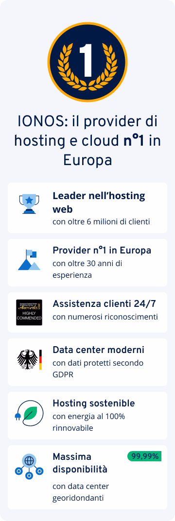 La qualità dell'hosting gioca un ruolo fondamentale. Ecco perché ottimizziamo i nostri server appositamente per WordPress, in modo che i contenuti siano raggiungibili in pochi secondi e il tuo sito si carichi velocemente. È un aspetto importante sia per i visitatori, che non avranno lunghi tempi di attesa, sia per il ranking di Google. Ora che conosci i vantaggi dell'hosting WordPress di IONOS, non ti resta che decidere quale hosting scegliere per WordPress in base alle tue esigenze.