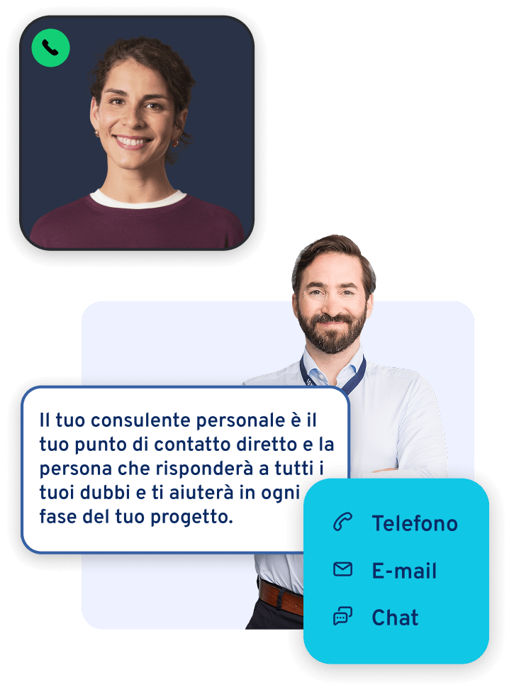 Dopo aver effettuato l'ordine, il tuo consulente personale è a tua disposizione. Ti supporterà in modo proattivo nei tuoi progetti.